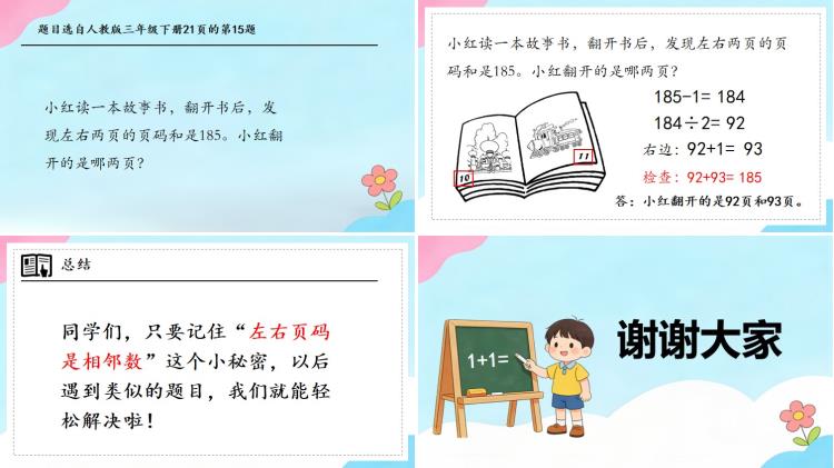 同学们,只要记住“左右页码是相邻数”这个小秘密,以后遇到类似的题目,我们就能轻松解决啦!