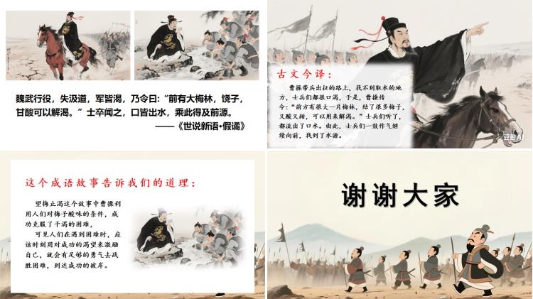 曹操带兵出征的路上,找不到取水的地方,七兵们都很口渴,于是,曹操传令:“前方有很大一片梅林,结了很多梅子,又酸又甜,可以用来解渴。”七兵们听了,都流出了口水。由此,七兵们一鼓作气继续向前,找到了水源。