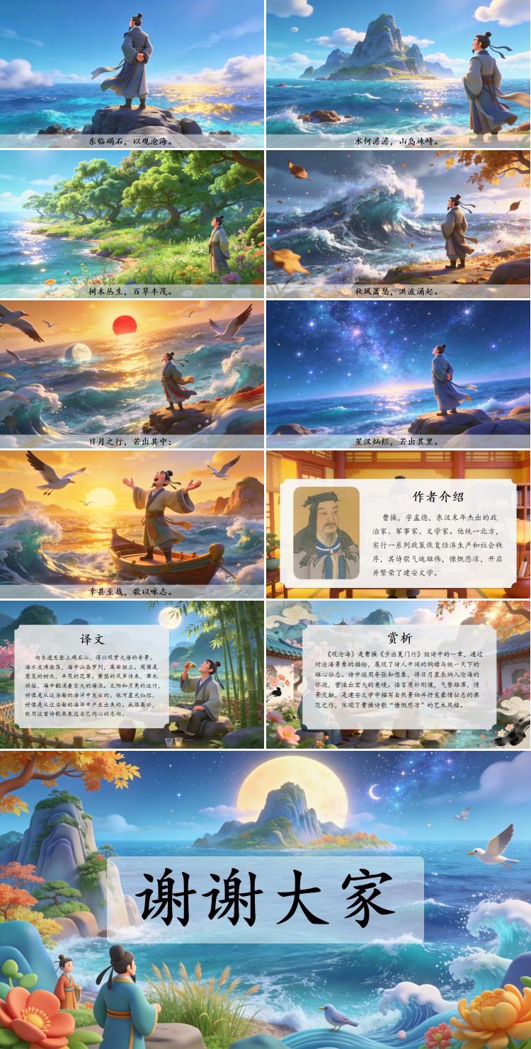 《观沧海》是曹操《步出夏门行》组诗中的一章,通过对沧海景象的描绘,展现了诗人开阔的胸襟与统一天下的雄心壮志。诗中运用夸张和想象,将日月星辰纳入沧海的怀抱,营造出宏大的意境。语言质朴刚健,气势雄浑,情景交融,是建安文学中描写自然景物并抒发豪情壮志的典范之作,体现了曹操诗歌“慷慨悲凉”的艺术风格。