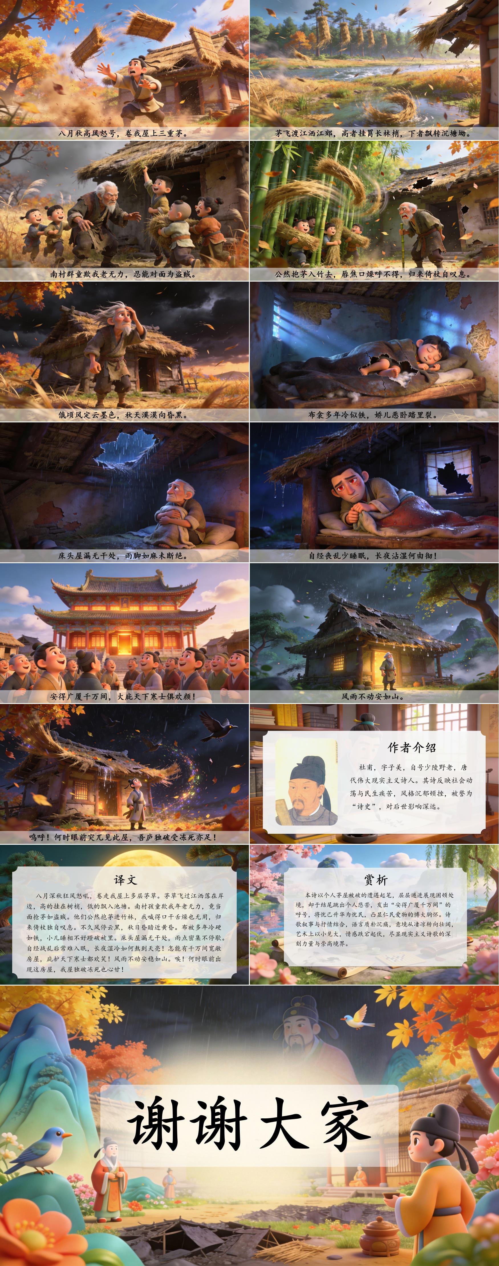 本诗以个人茅屋被破的遭遇起笔,层层递进展现困顿处境,却于结尾跳出个人悲苦,发出“安得广厦千万间”的呼号,将忧己升华为忧民,凸显仁民爱物的博大胸怀。诗歌叙事与抒情结合,语言质朴沉痛,意境从凄凉转向壮阔,艺术上以小见大,情感跌宕起伏,尽显现实主义诗歌的深刻力量与崇高境界。