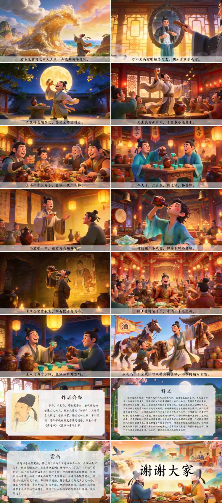 你难道没有看见,那黄河之水从天上奔腾而来,波涛滚滚直奔东海,再也没有回来。你难道没有看见,那年迈的父母对着明镜悲叹自己的白发,早晨还是满头青丝,傍晚却变得如雪一般。人生得意之时就应当纵情欢乐,不要让这金杯无酒空对明月。上天造就了我的才干就必然是有用处的,千两黄金花完了也能够再次获得。我们烹羊宰牛姑且作乐,一次痛饮三百杯也不为多!岑夫子和丹丘生啊,快喝酒吧,不要停下杯子。让我为你们唱一首歌,请你们为我倾耳细听。山珍海味的豪华生活算不上什么珍贵,只希望能醉生梦死而不愿清醒。自古以来圣贤都感到孤独寂寞,只有那会喝酒的人才能够留传美名。陈王曹植当年设宴平乐观,喝着名贵的酒纵情地欢乐。你为何说我的钱不多?只管买酒来让我们一起痛饮。名贵的五花良马,昂贵的千金皮衣,快叫侍儿拿去统统换美酒,让我们一起来消除这无尽的万古长愁!